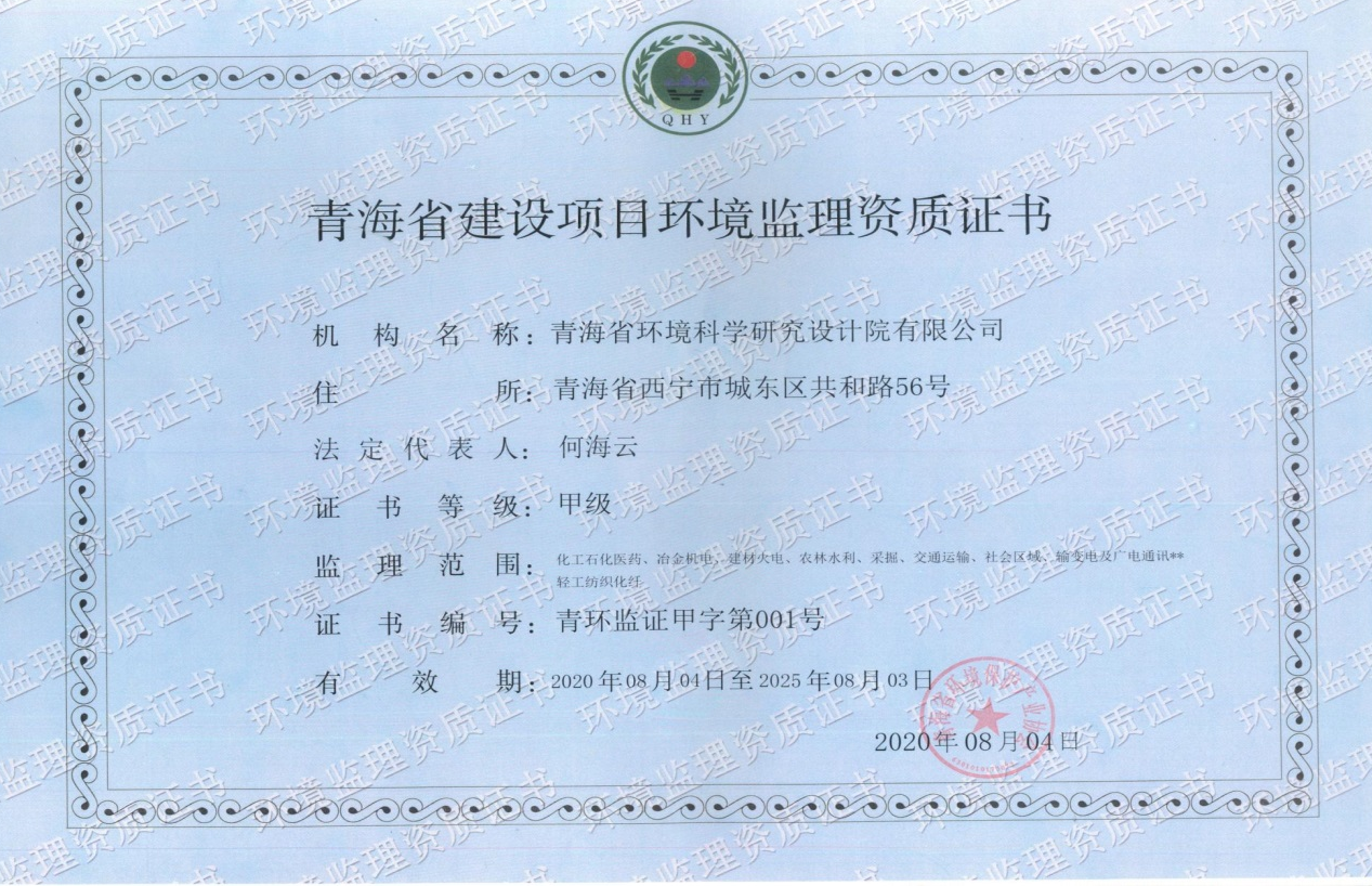 《青海省建設(shè)項(xiàng)目環(huán)境監(jiān)理資質(zhì)證書(shū)》,甲級(jí)資質(zhì),青海省環(huán)境保護(hù)產(chǎn)業(yè)協(xié)會(huì)頒發(fā),2020年8月4日