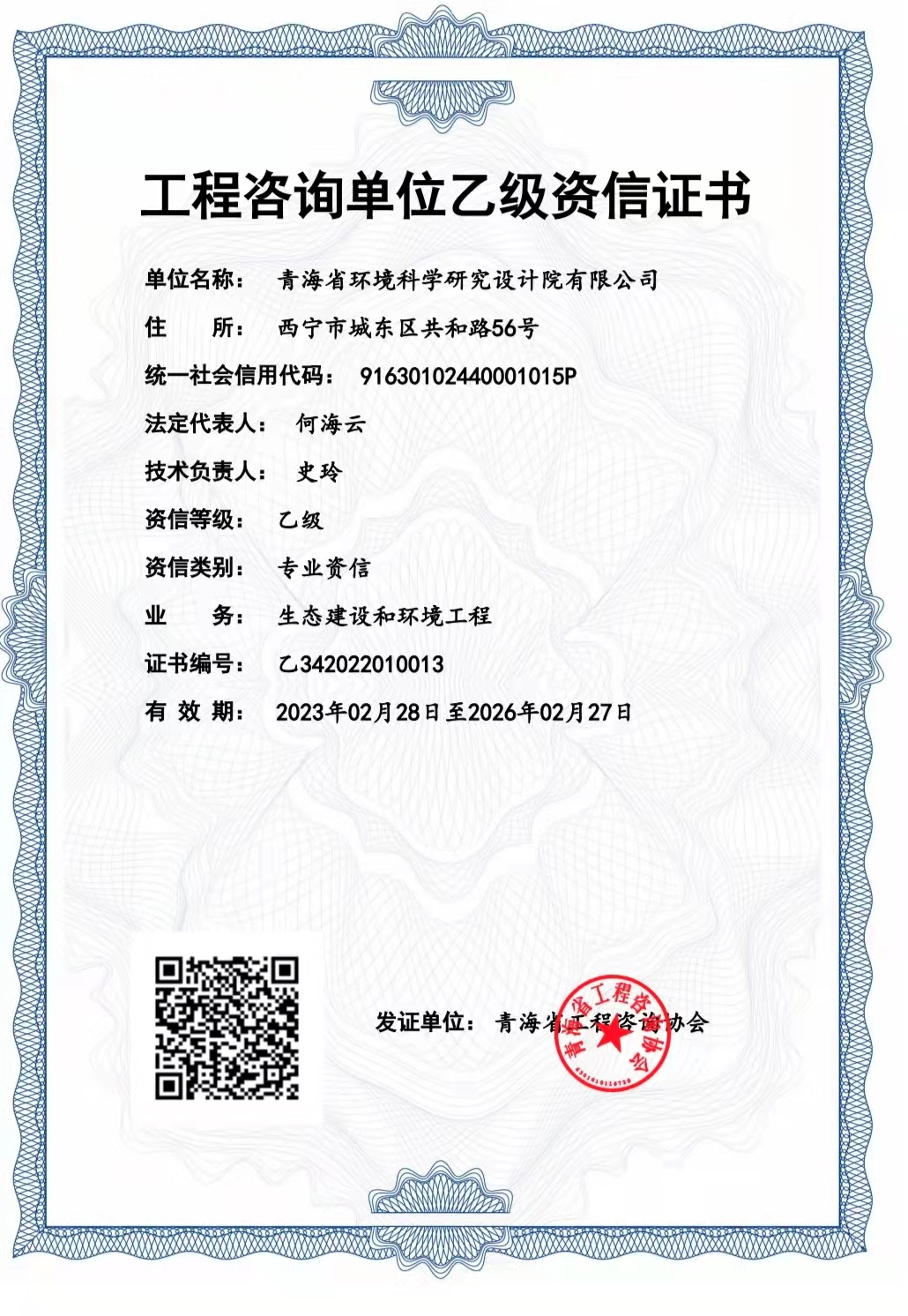 《工程咨詢單位乙級(jí)資信證書(shū)》,青海省工程咨詢咨詢協(xié)會(huì)頒發(fā),2023年2月8日