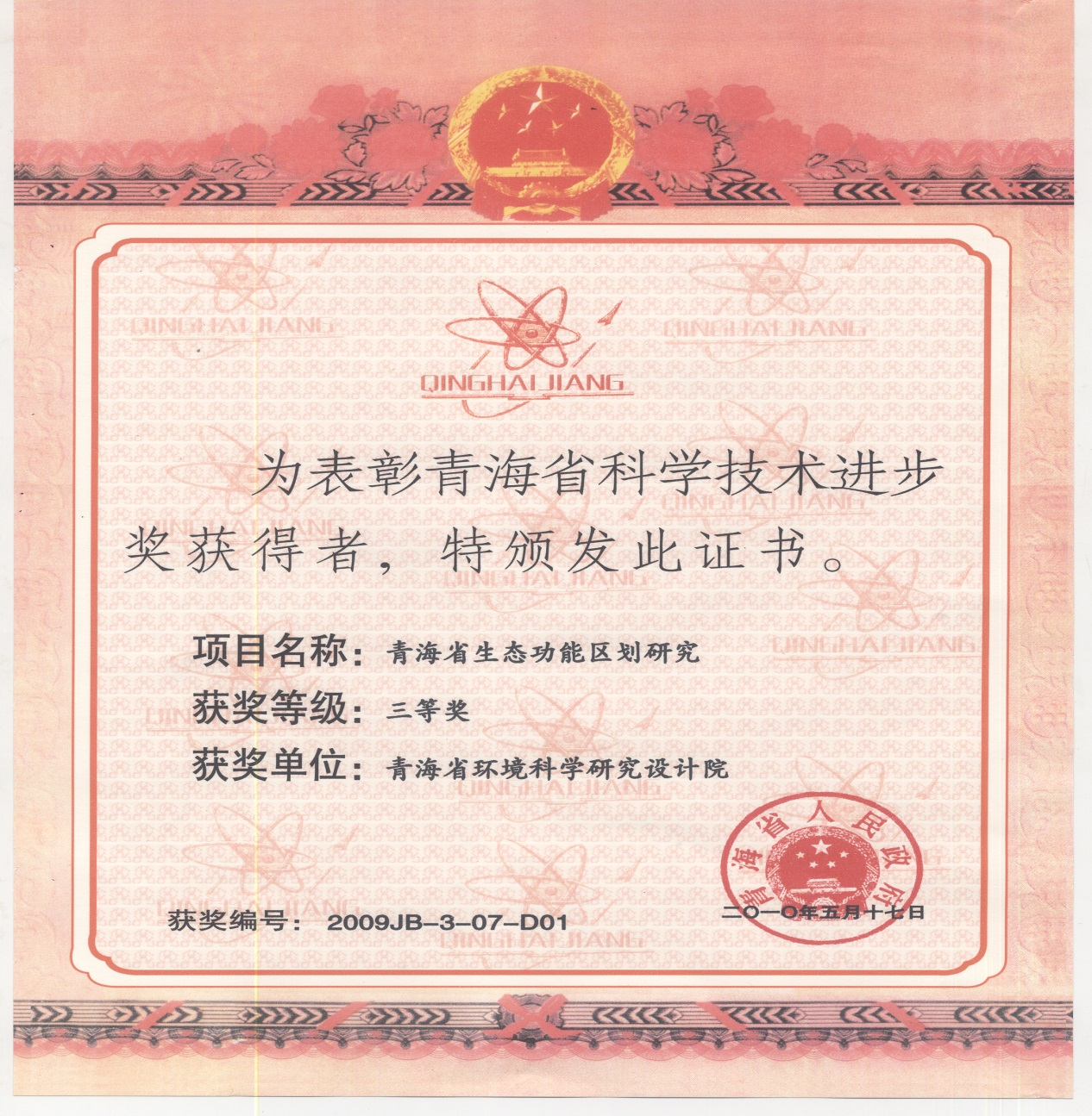 青海省科學(xué)技術(shù)進(jìn)步獎(jiǎng)三等獎(jiǎng),青海省人民政府頒發(fā),2010年5月17日